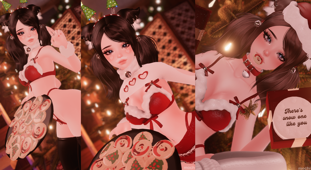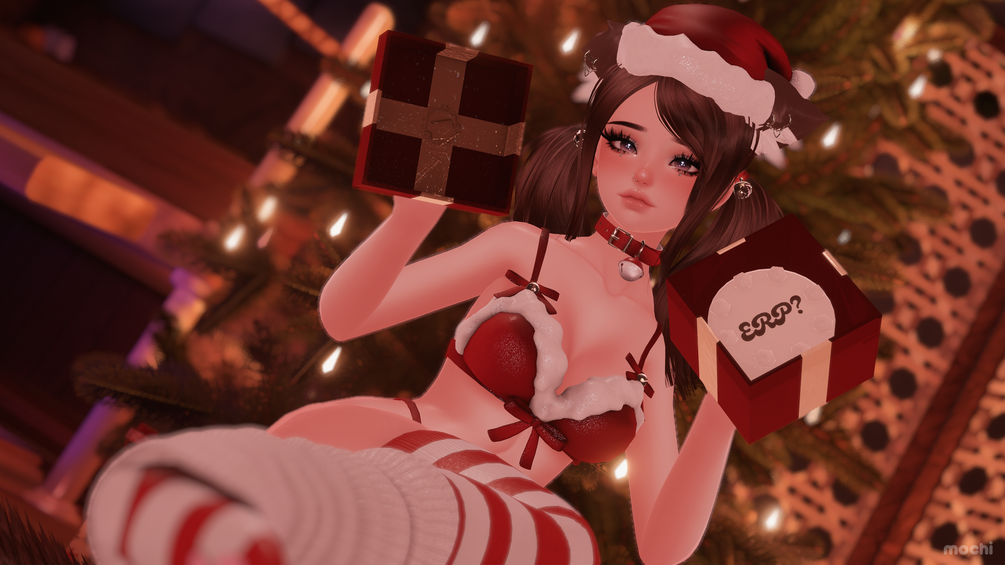 - Body RP Base and tail (In server freebies), Comfy outfit- zinpia , RP Base Textures and Amelia Head Textures- Ying.vr, Amelia Head and Lashes addon/- Sivka. (Must not reused off my model under any circumstance) , Lover Eye texture - Fair , Body Piercings - Skuny , Glasses- Kri , Hair textures - cici , Pigtail Hair - Yuri , Long hair - Nessy , Santa outfit - Nessy , Heart Top and paws - Fooly, Socks - ImLexZ , Skirt - Velvet , Ankle Socks - Moobeans , Ears - Love , Rings - Sockembopem , Tree bopper - Nanochip , Candy cane/Stache - wen , Cookies - Freaking_Cute , Crying animation - Axphy , Cute face filters - smoluni , Present - Teacakex tongue - vastaya